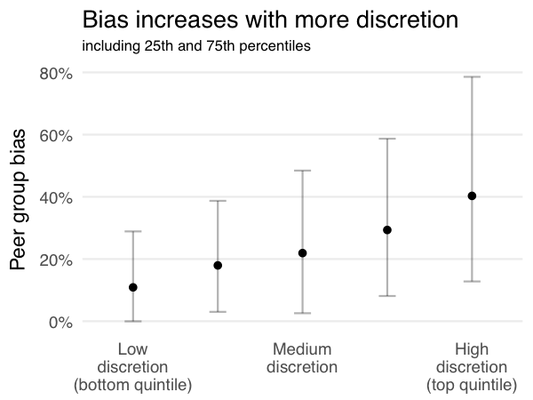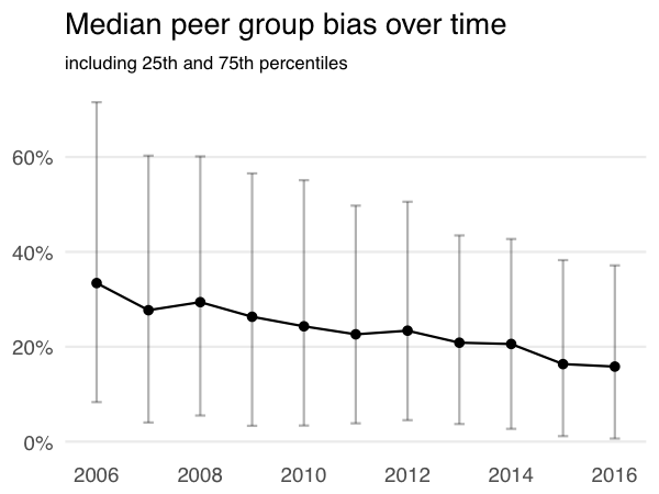 We also demonstrate that ambiguity about the membership in a neutrally chosen peer group is being used strategically by firms to increase the size of peer group bias. When it is relatively obvious whom the firm should be choosing as peers, the bias tends to be smaller. Conversely, peer group bias is larger when firms have more discretion due to the set of plausible peers as well as the spread of the pay of their CEOs being relatively large. Figure 3 shows the median, 25th percentile and 75th percentile of peer group bias expressed as a percent of the median pay of a neutrally chosen peer group. This figure shows that bias is generally larger when firms have more discretion in the choice a peer group.