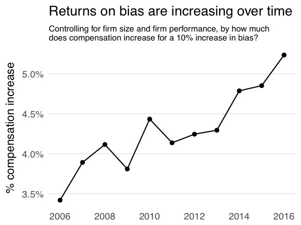 As Figure 1 shows, the size of the peer group bias has been diminishing over time since the 2006 SEC requirement that firms disclose their compensation peer groups in their corporate reports. This may be a consequence of the requirement for periodic say on pay votes on executive compensation in the 2009 Dodd-Frank Act along with the greater scrutiny of compensation practices by watchdog agencies such as Institutional Shareholder Services. However, Figure 2 shows that the predictive effect of bias on pay has gone up, which offsets the consequences of the decline in bias shown in Figure 1.