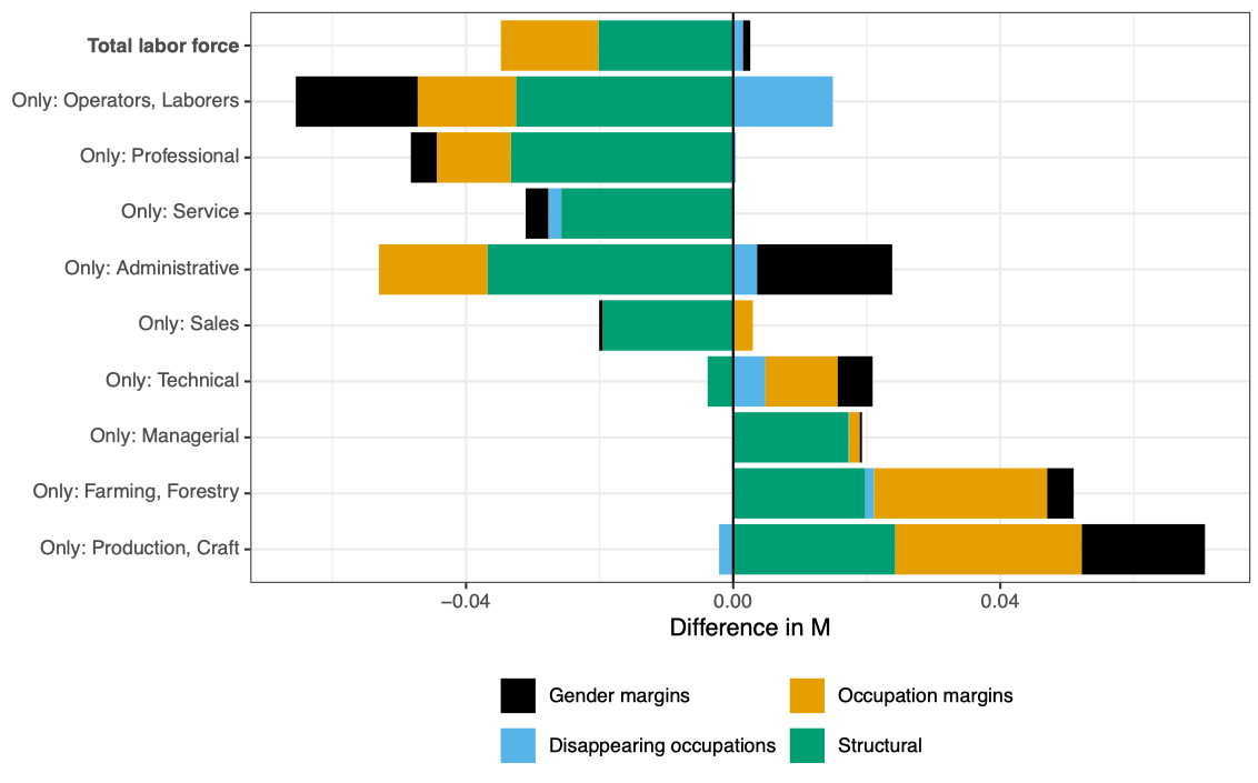 The data source is the U.S. Census and the American Community Survey, downloaded from IPUMS. Harmonized occupational codings come from IPUMS. Some 50 occupations vanish over time, but no new occupations are introduced. The decomposition was carried out for the whole population, as well as for 9 major occupational groups separately.