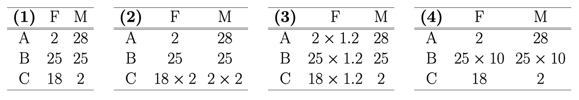 Consider the following four tables, which cross-classify the number of male and female employees across the occupations A, B, and C. Table (1) shows the baseline situation. In Table (2), occupation C has grown, while in Table (3) female employment increased across all occupations. Table (4) shows an extreme example, where the integrated occupation B has grown strongly.